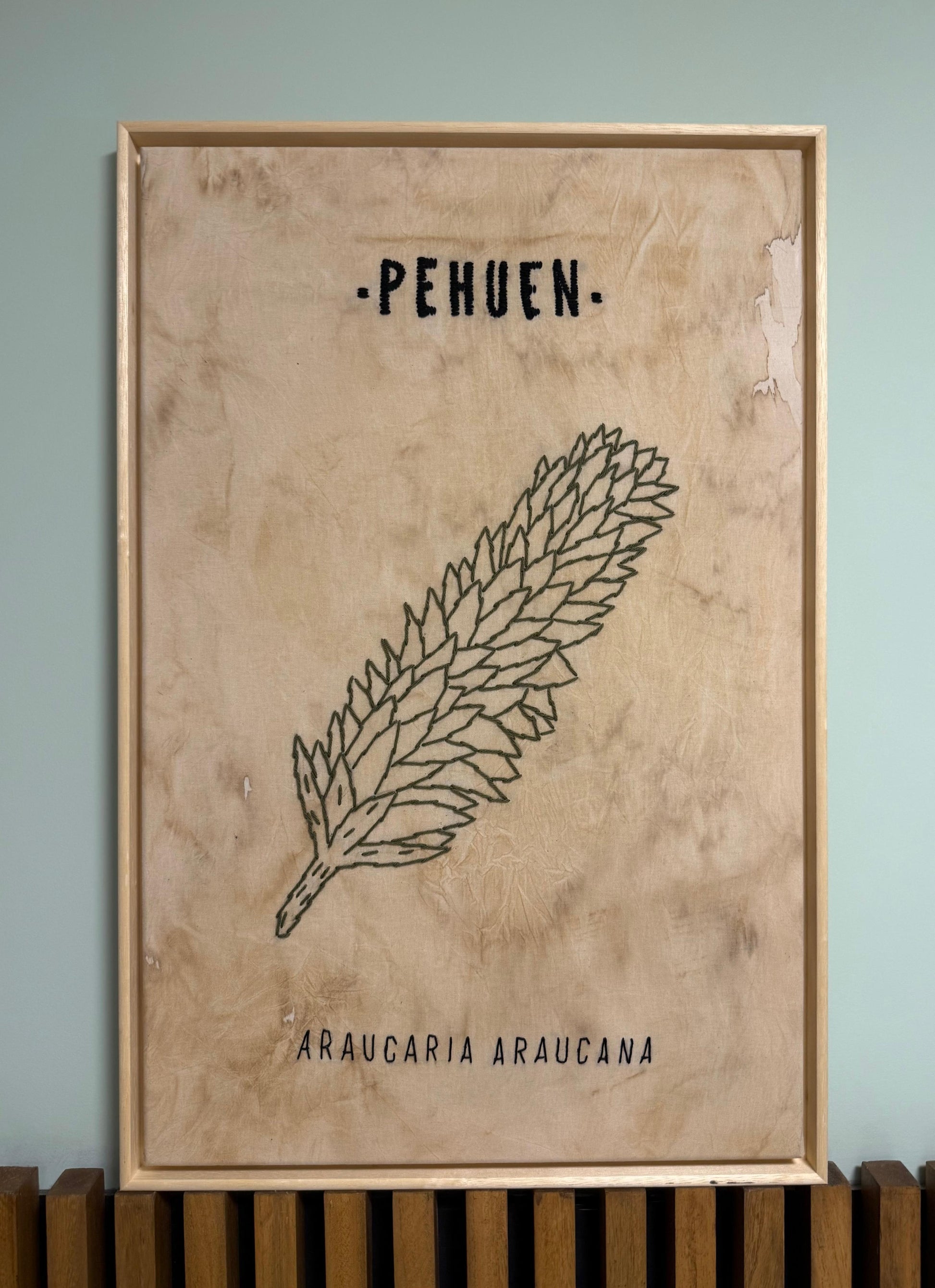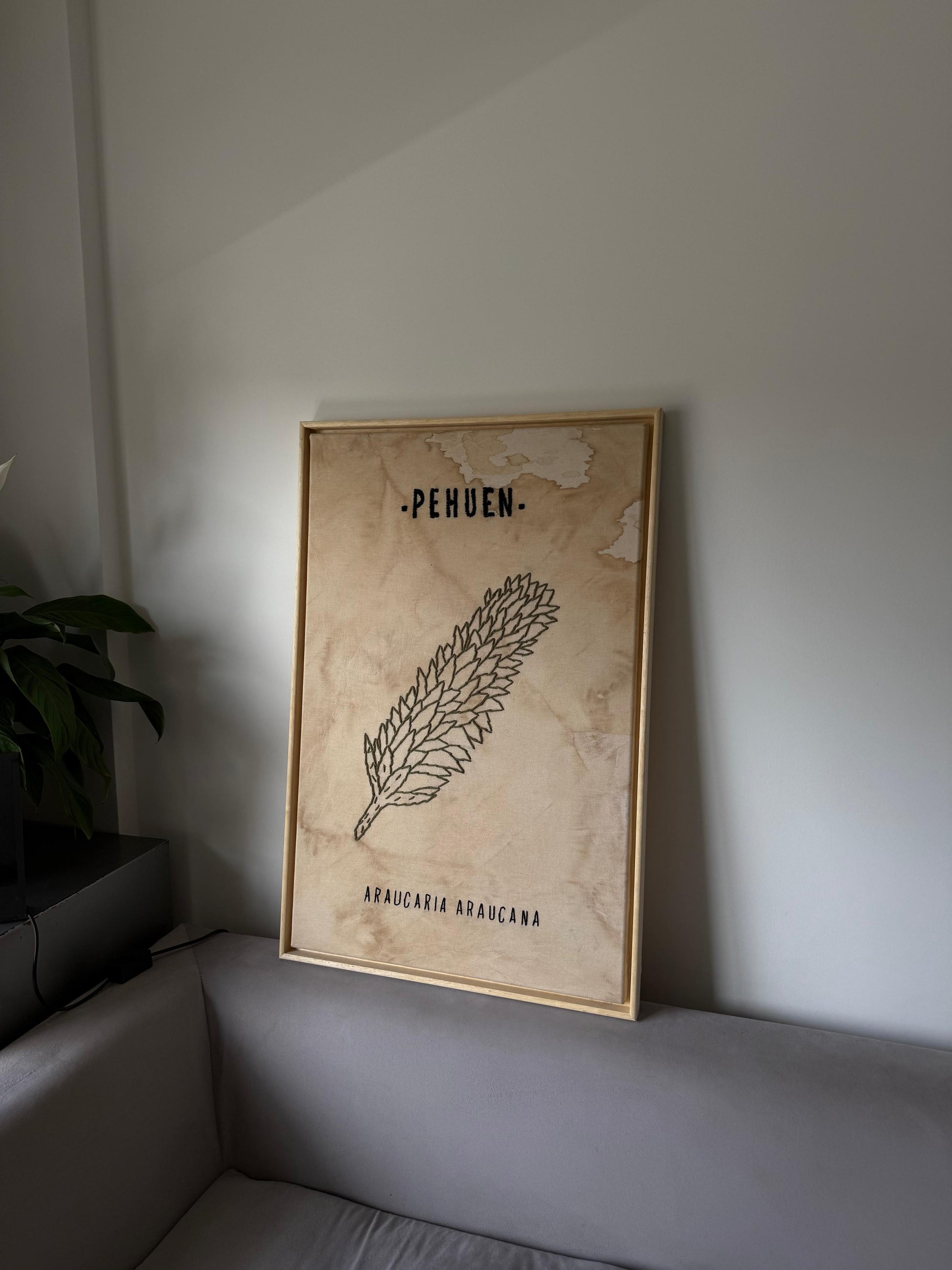 Diseño sobre rama del árbol Pehuen. El dibujo estilizado en verde sobre fondo con textura abstracta evoca naturaleza, calma y atemporalidad.