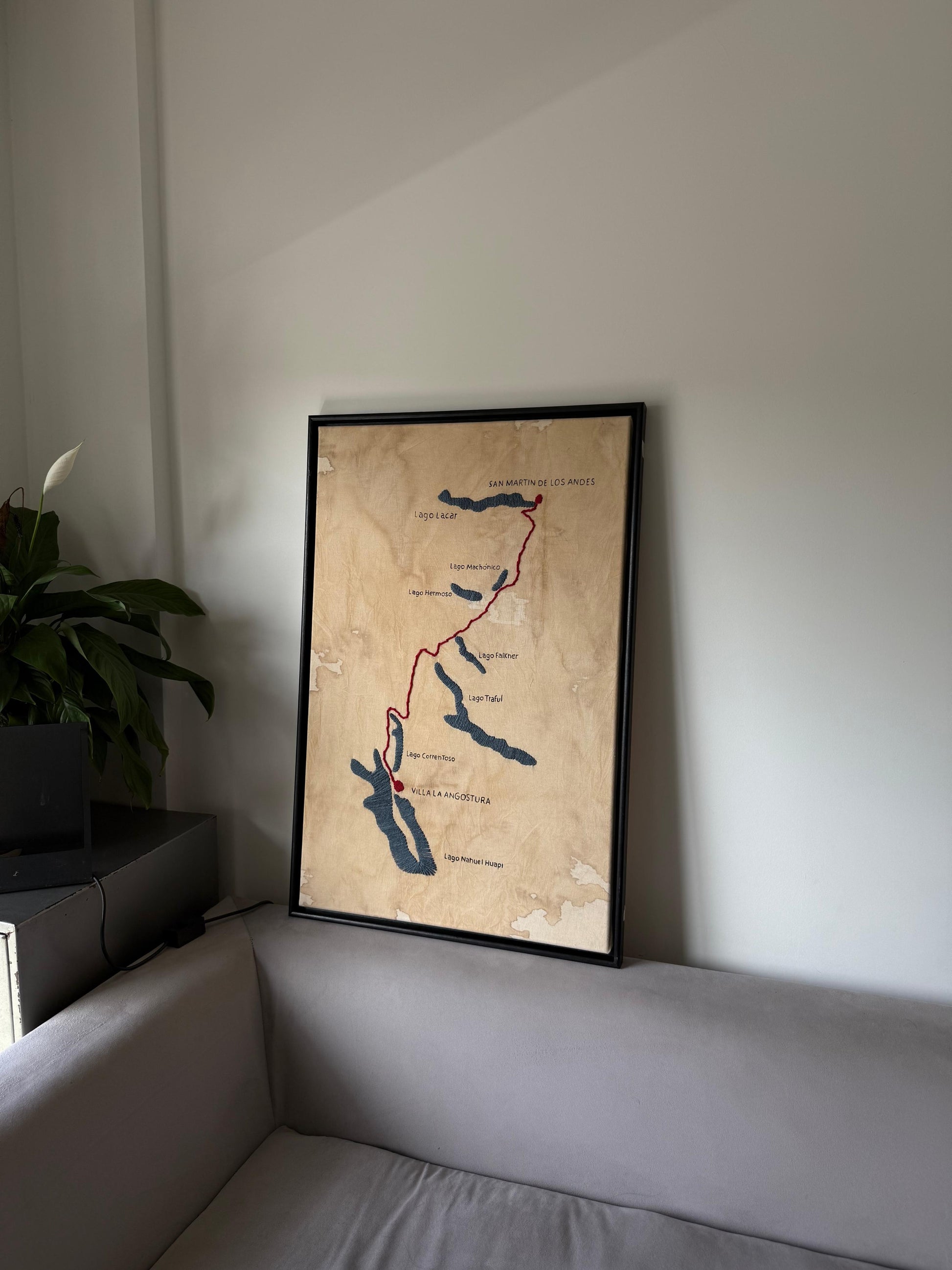 Mapa estilizado de la icónica Ruta de los 7 Lagos en la Patagonia argentina. Con marco negro fino.