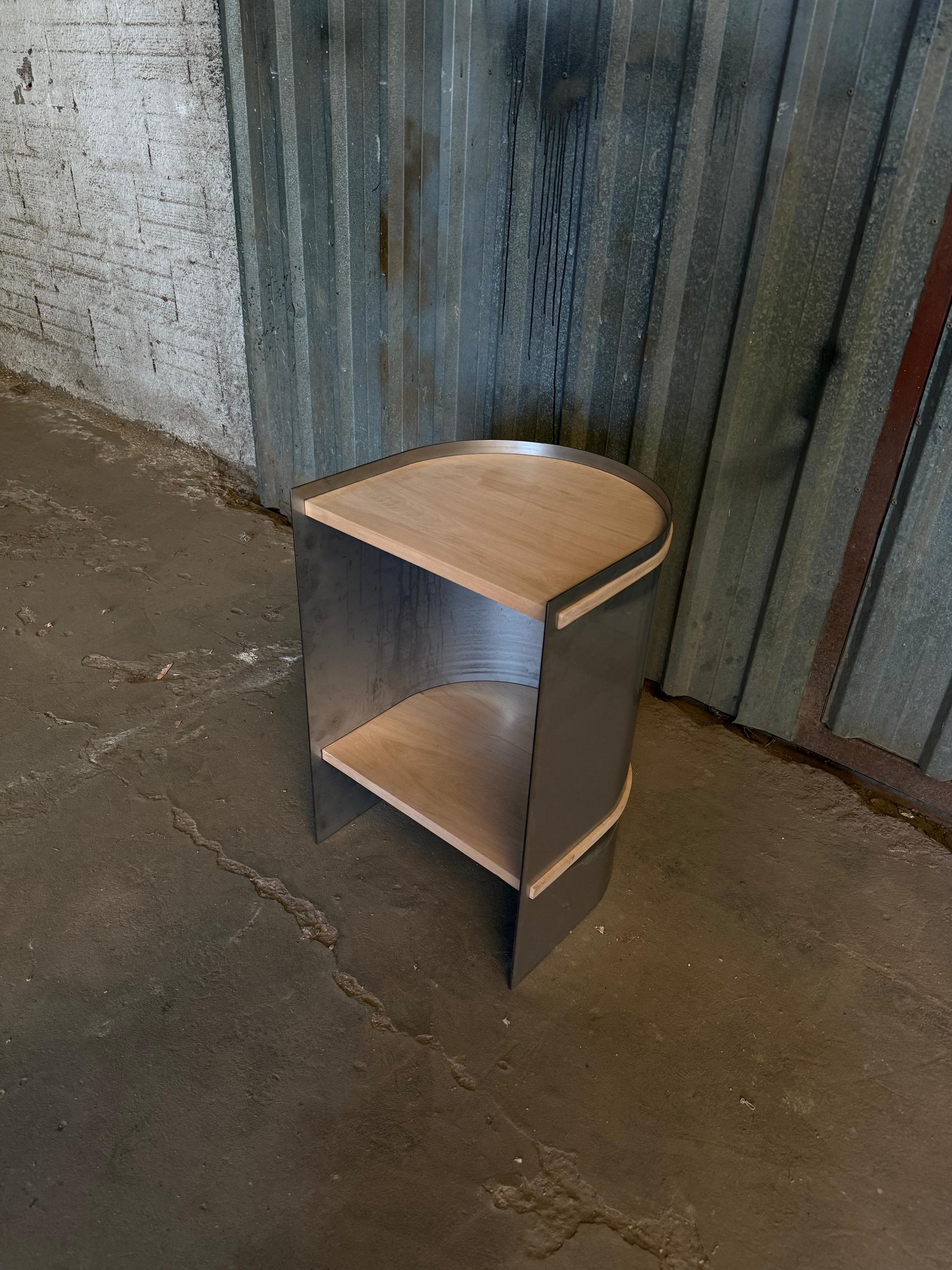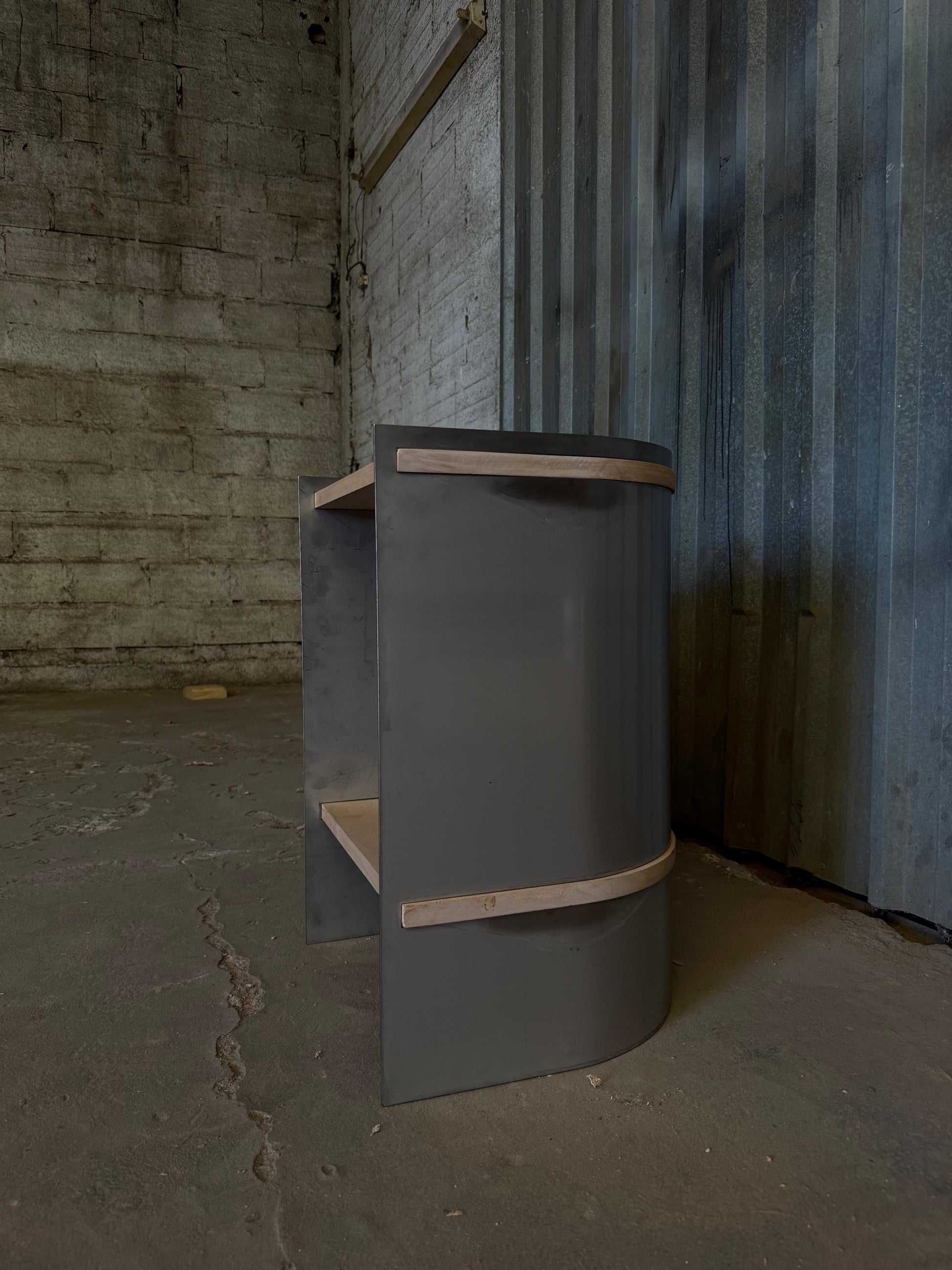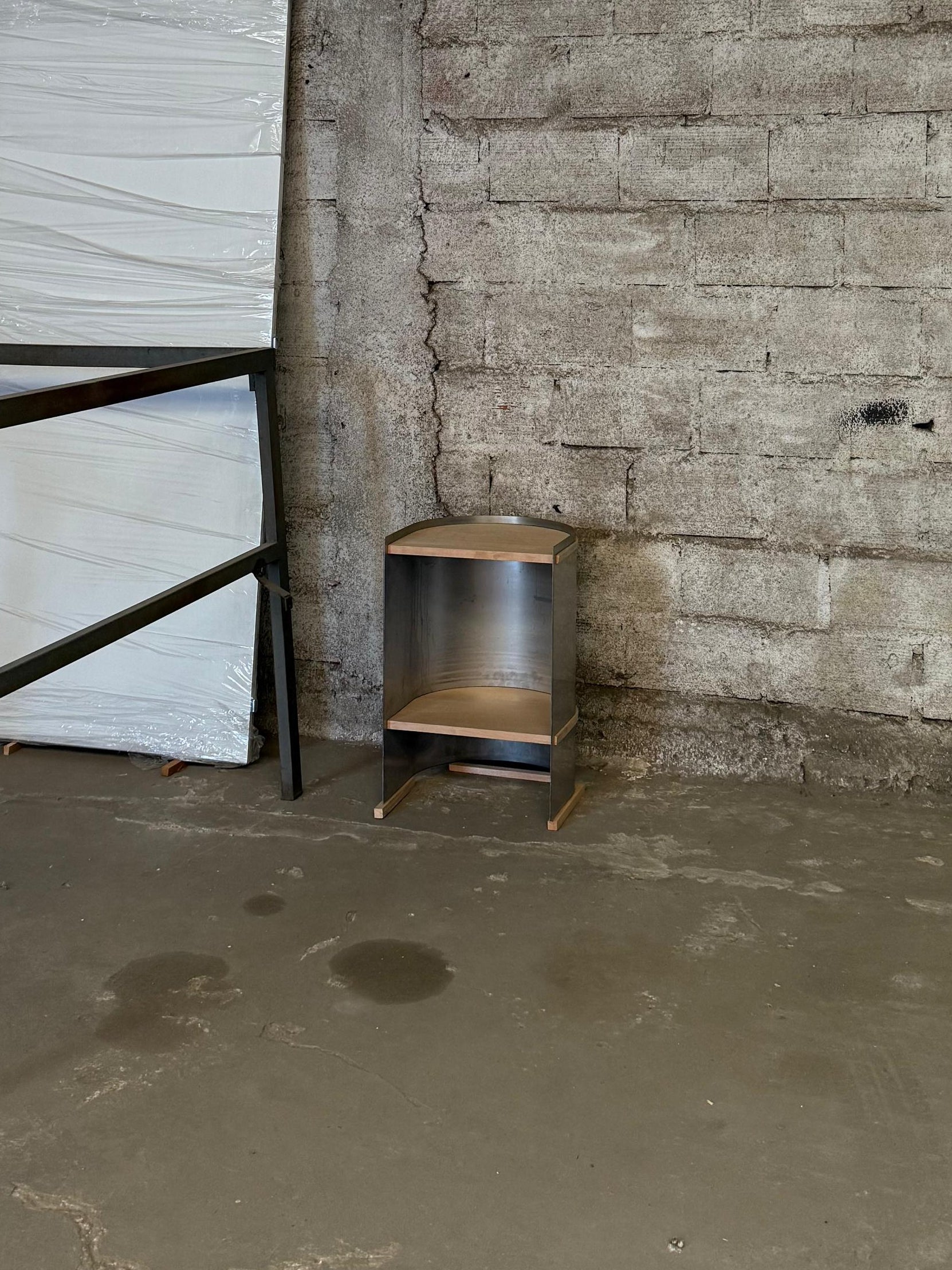 Su estructura curva en acero inoxidable opaco de 3 mm abraza dos estantes de madera maciza traida del sur, generando un contraste armónico entre lo industrial y lo orgánico.