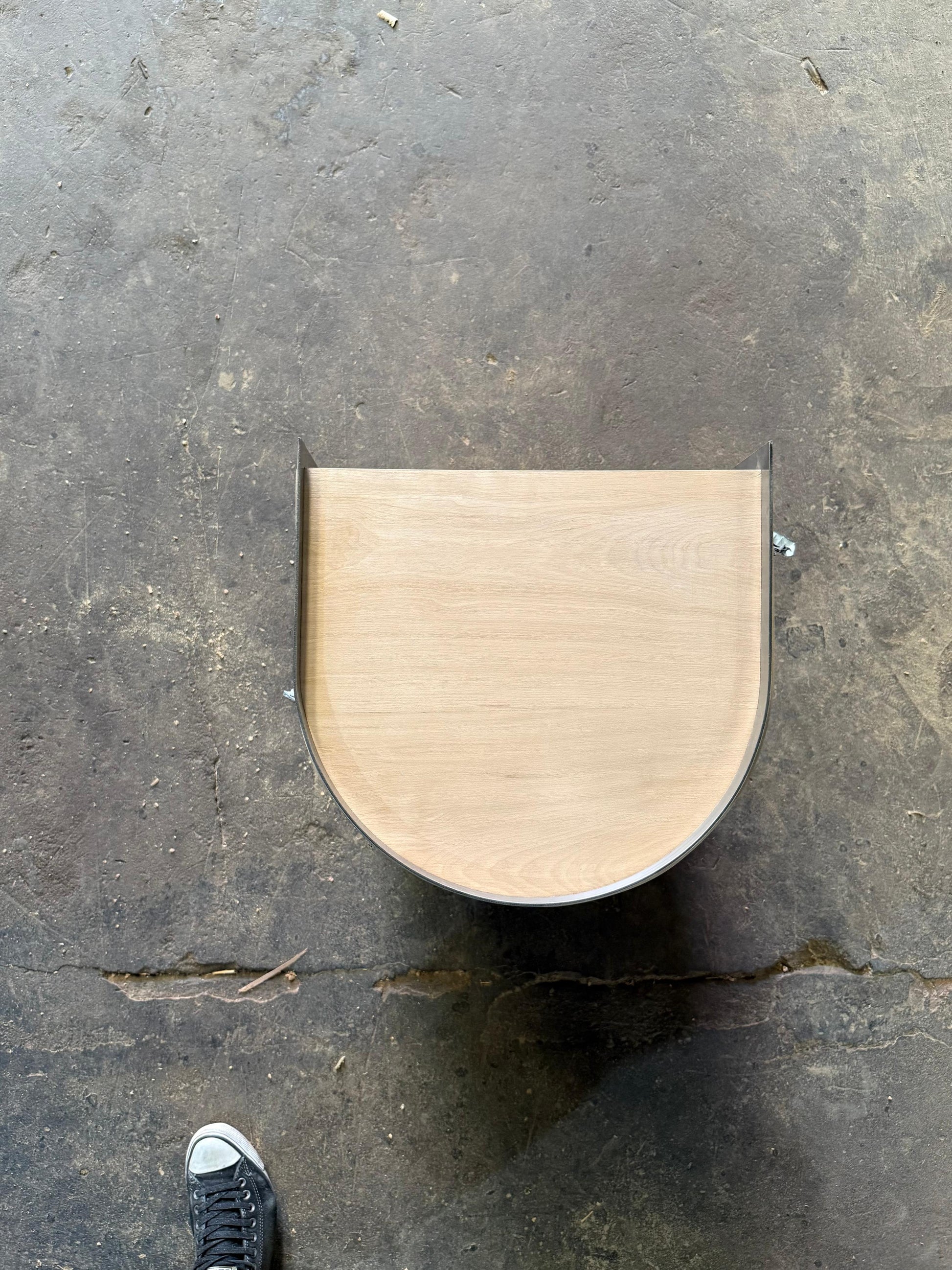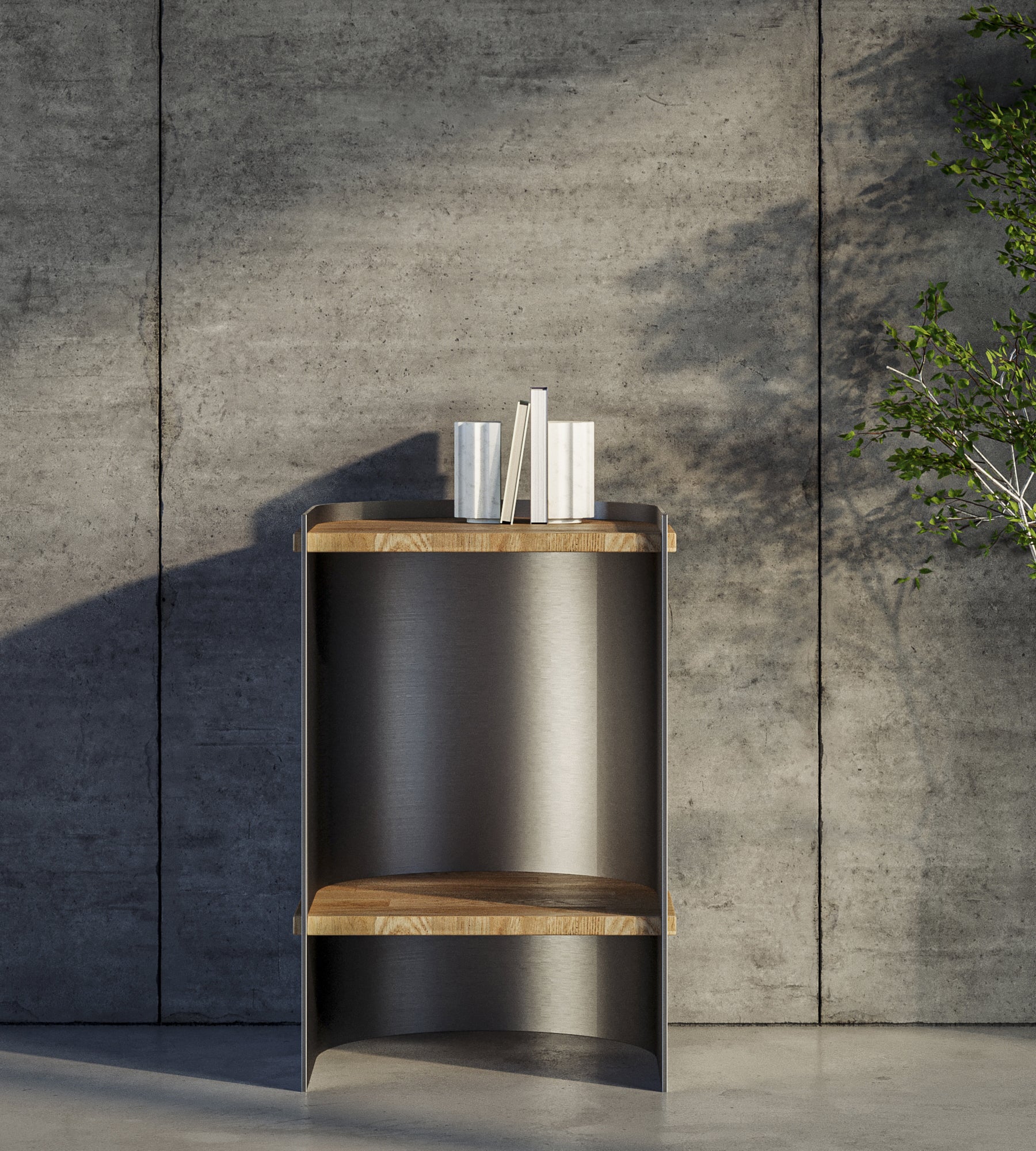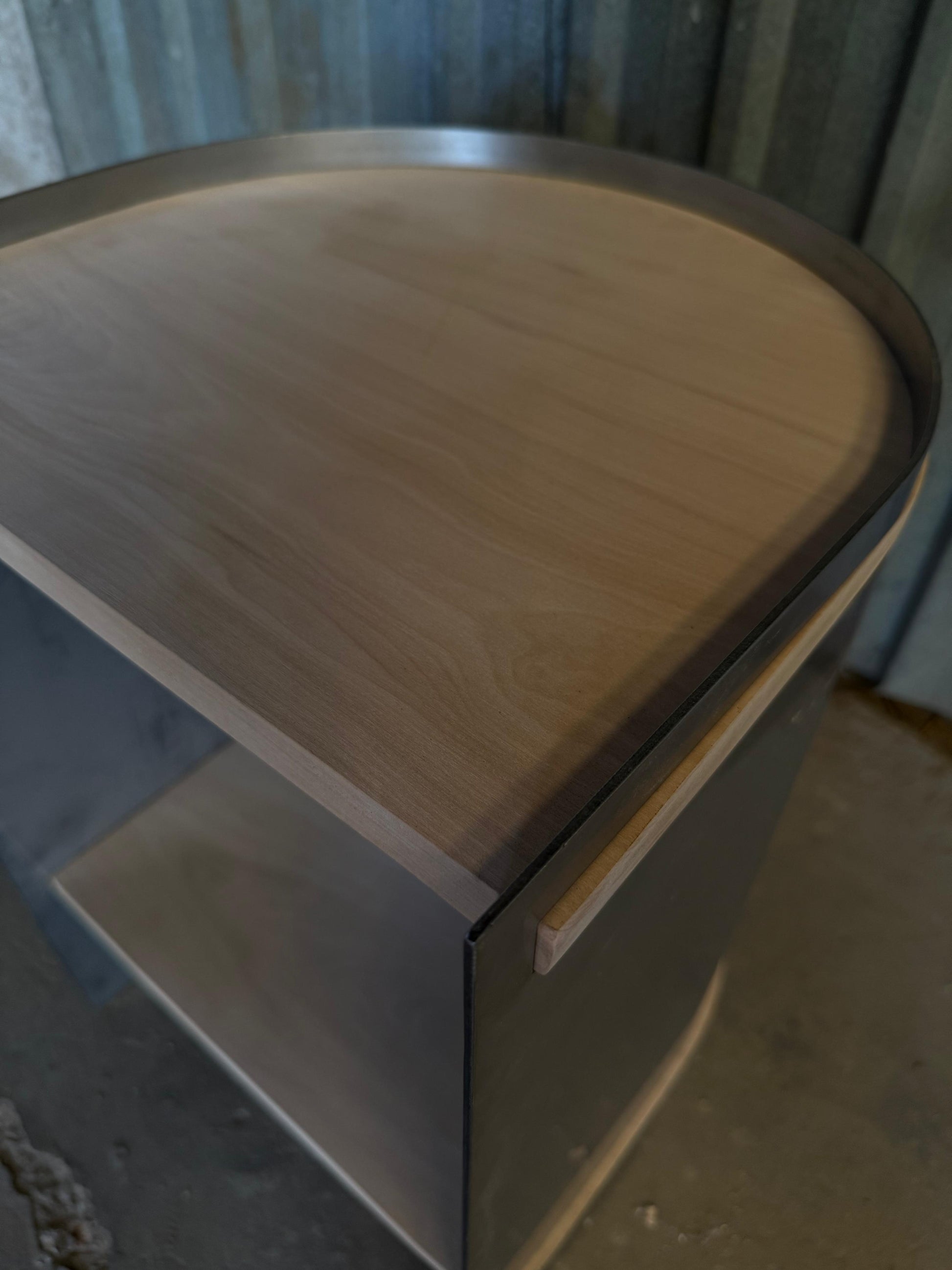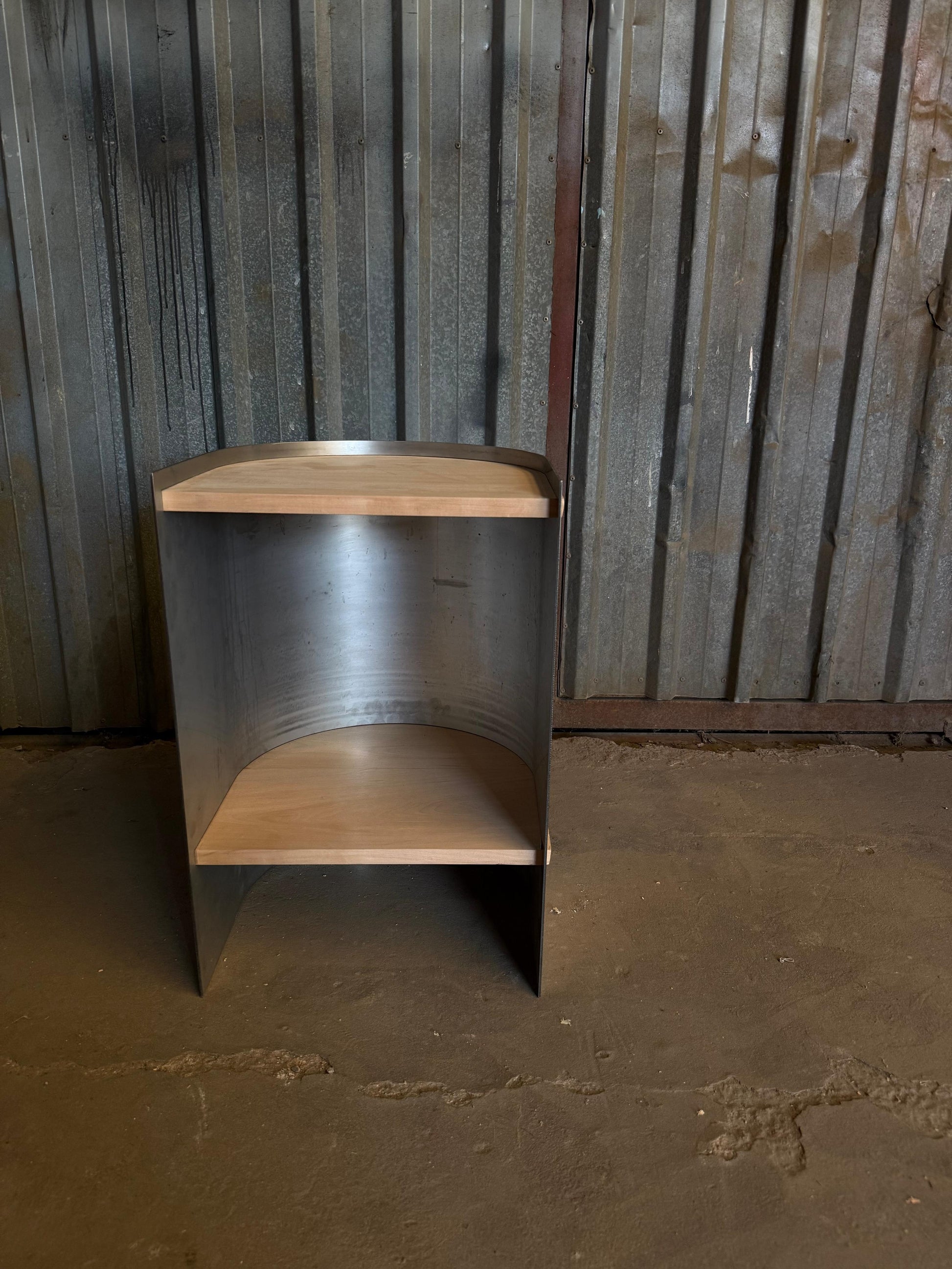 Su estructura curva en acero inoxidable opaco de 3 mm abraza dos estantes de madera maciza traida del sur, generando un contraste armónico entre lo industrial y lo orgánico.
